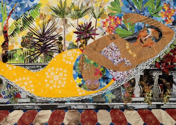 Ms JoannaManeckji was awarded the 2024 Most Promising Artist of the Year (Singapore) under the Emerging Artist Category for her artwork,"That Blessed Mood". Composed of paper collage on card paper,the artwork depicts a mother and child reclining in a hammock,peacefully enjoying a sunny afternoon in a garden. Beyond the joyous and contented image of motherhood,the antique photo album paper used as the mother's skin disguises a layer of paper from a Financial Times article with the words,"I'm not afraid". These powerful words signify a mother's strength beneath fragility,a poignant reminder of the resilience required in the journey of motherhood.